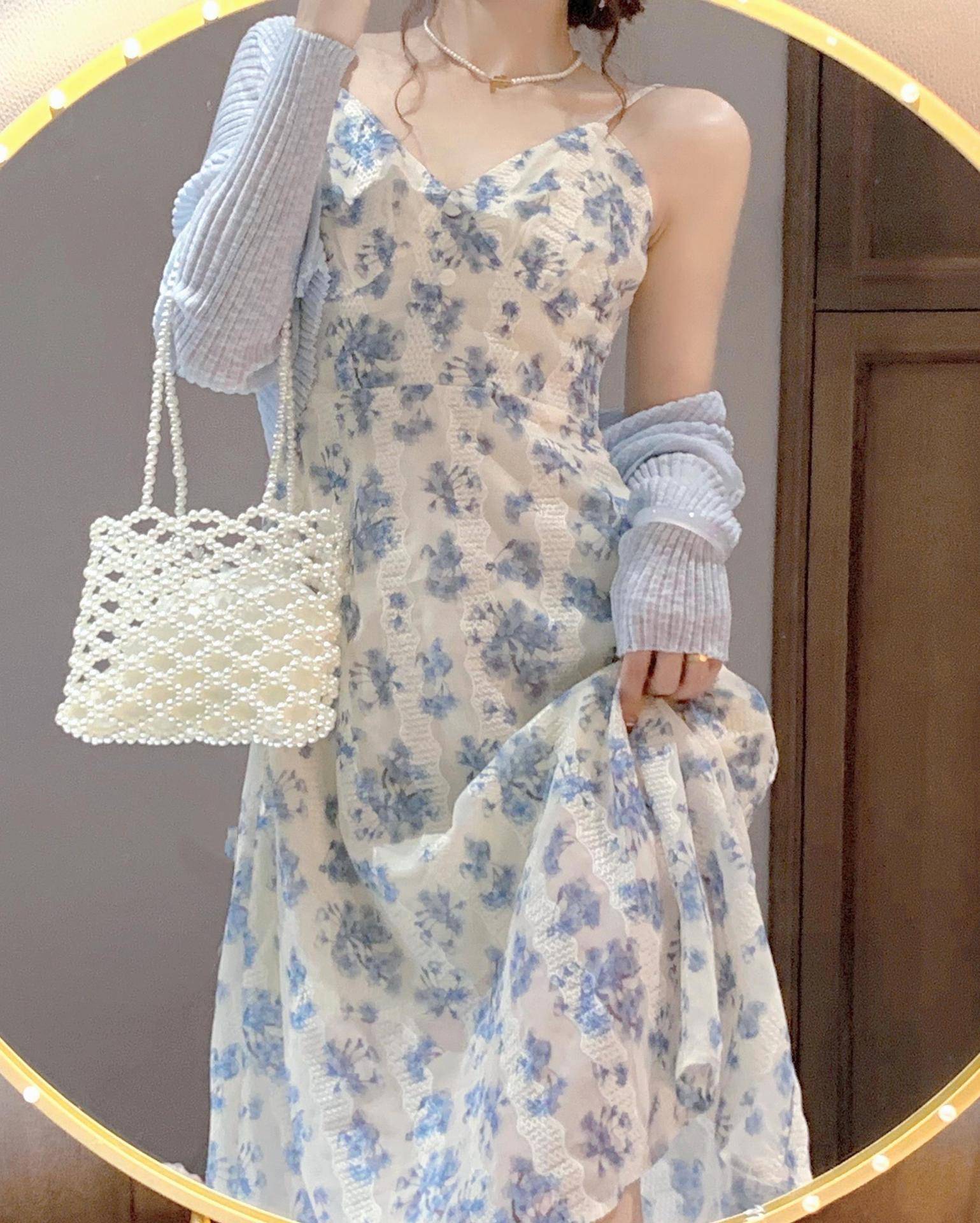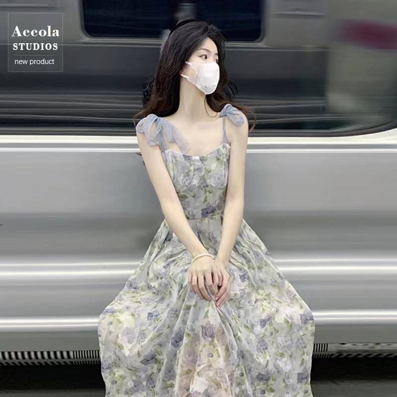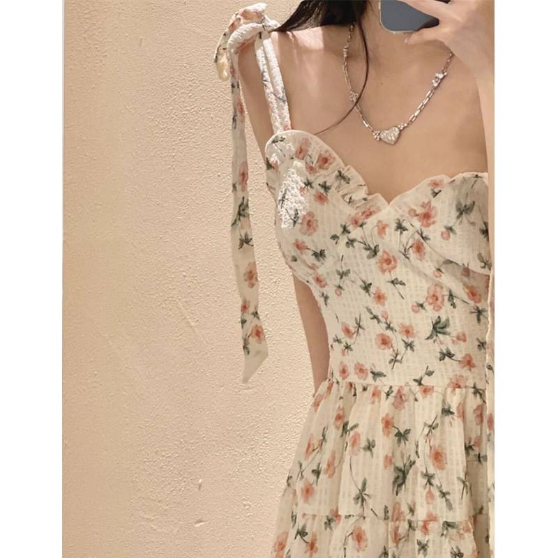 吊带连衣裙法式小众油画风仙气超仙森系茶歇初恋收腰裙子碎花长裙