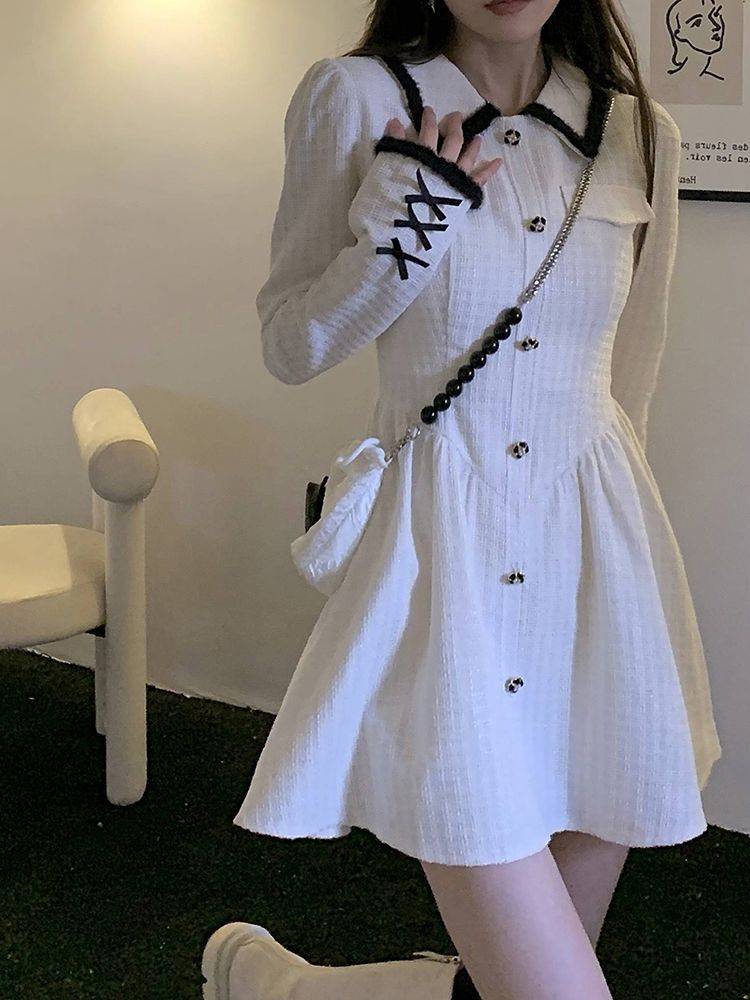 法式小香风白色连衣裙子女收腰气质长袖高级感短裙秋冬季2023新款