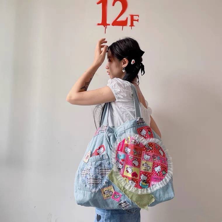 原创手工y2k千禧辣妹包牛仔拼贴帆布爱心kt复古单肩斜挎包