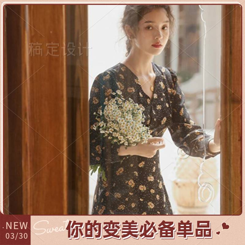 2020春复古v领长袖中长款小雏菊碎花雪纺连衣裙秋季裙子女