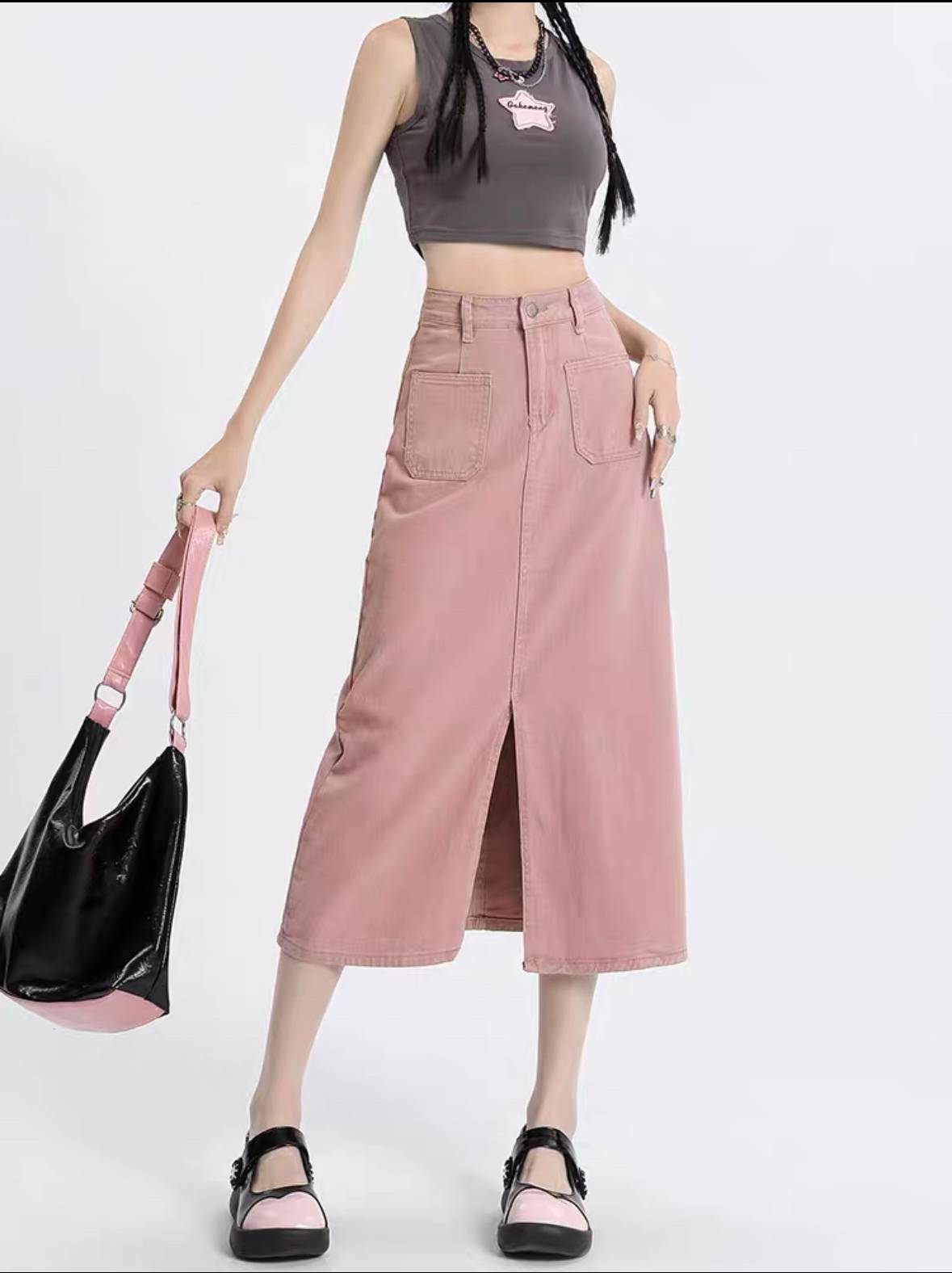 粉色牛仔半身裙女夏季薄款高腰梨形身材开叉中长半裙