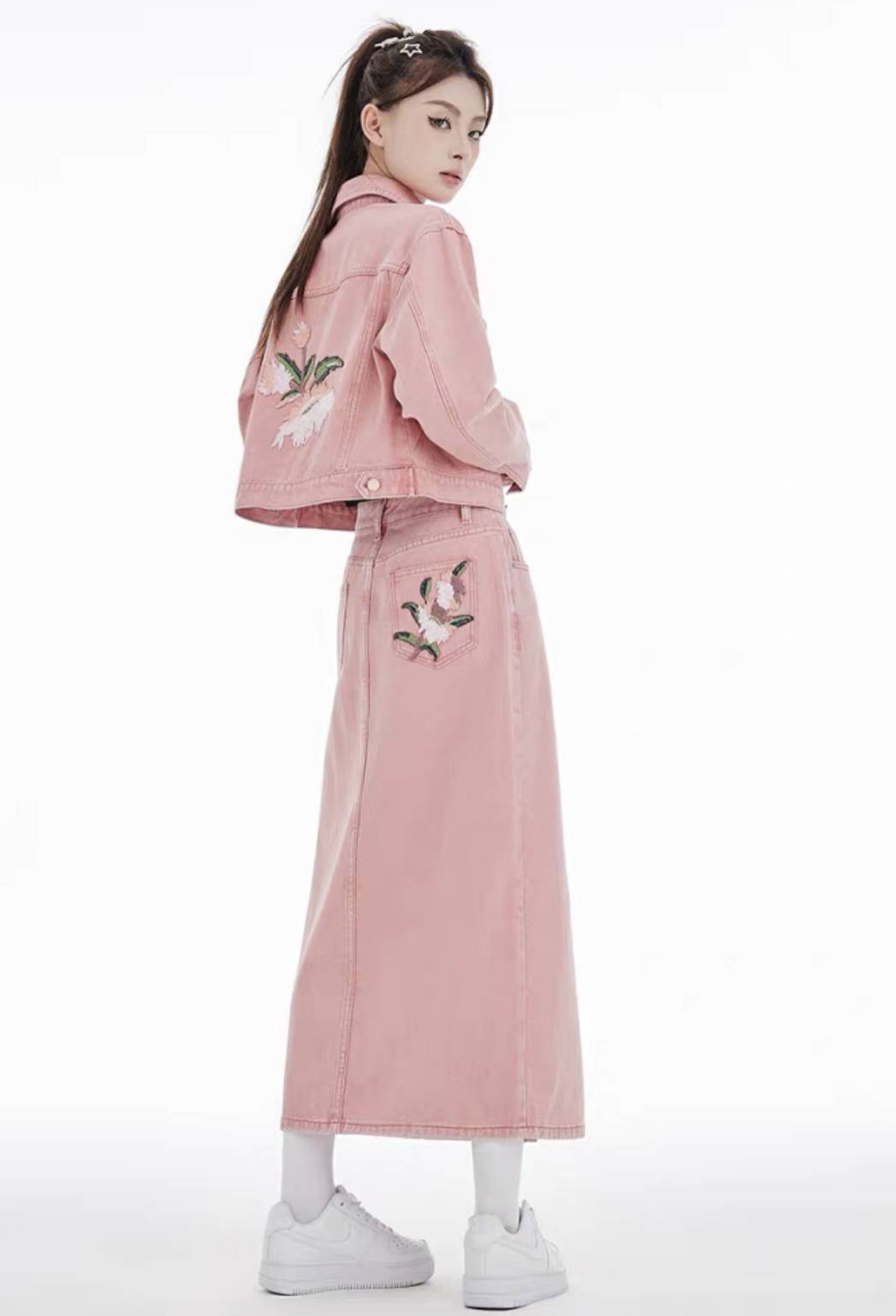 粉色牛仔套装秋季2023新款中国风刺绣短外套开高腰叉半身裙两件