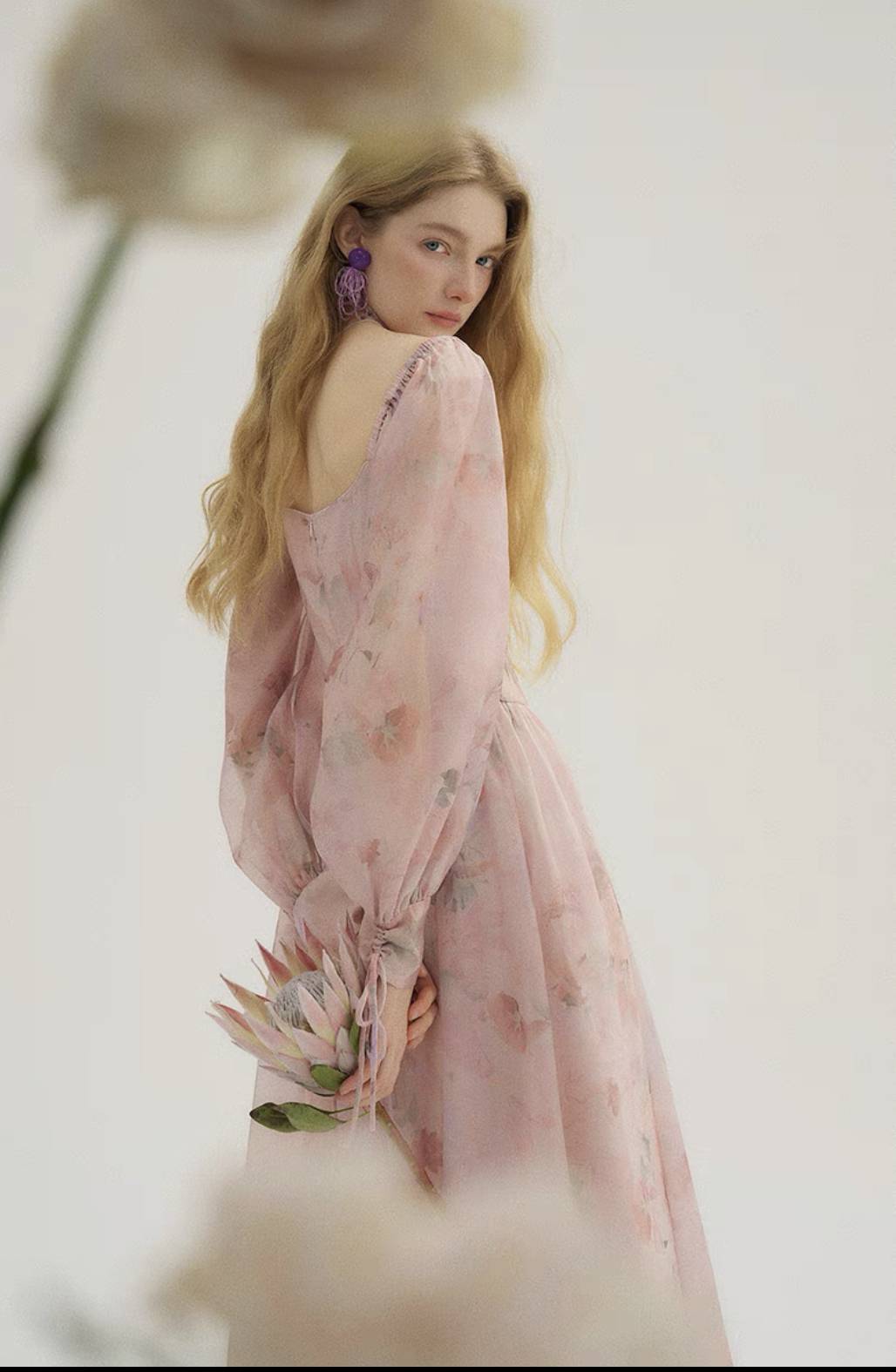 粉色连衣裙长袖碎花裙秋冬高级感长裙法式裙子女秋季新款