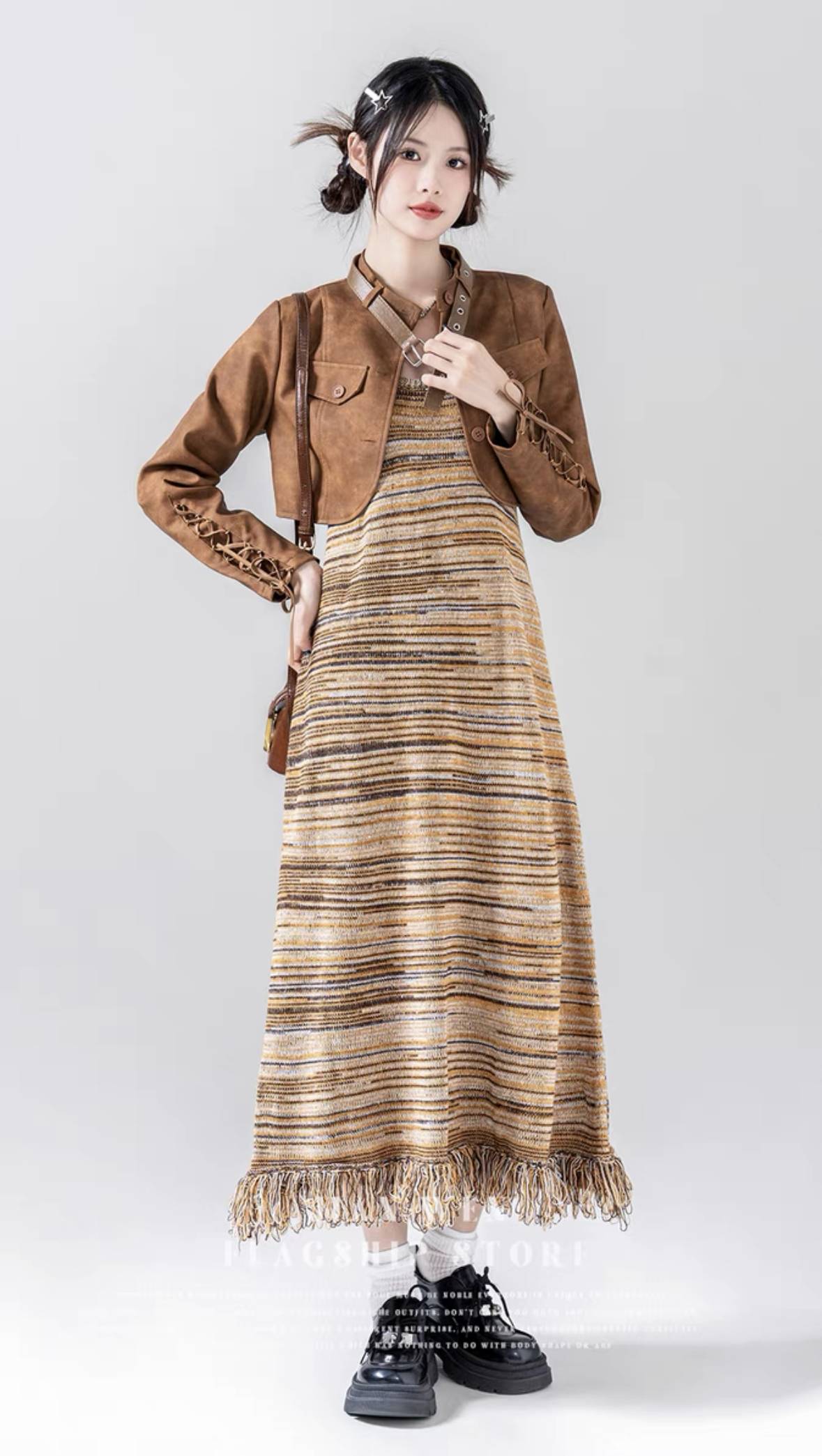 简温2023秋冬新款复古条纹针织吊带连衣裙女流苏撞色长款a字裙潮