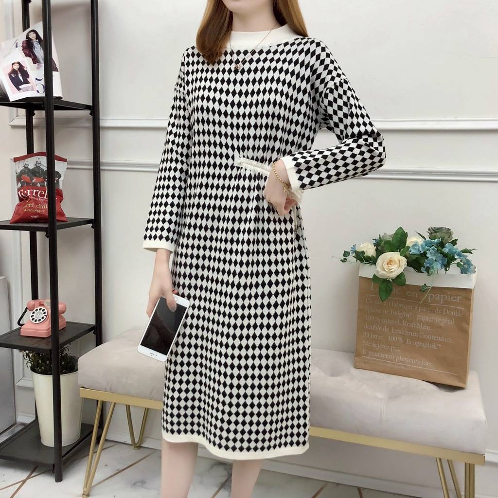 毛衣女2018秋季新款小方格抽绳针织衫韩版宽松大码长款女装连衣裙