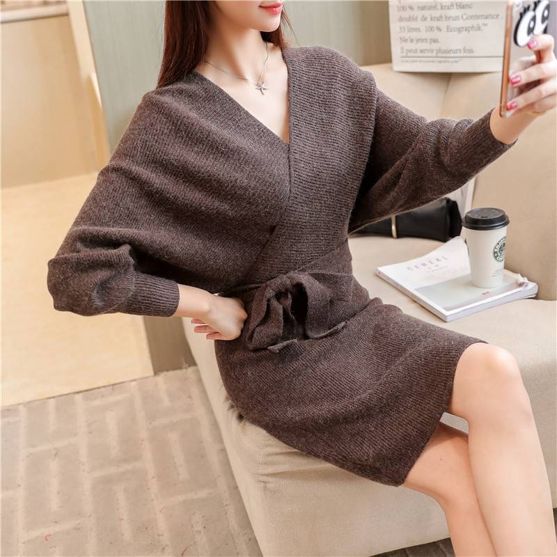 毛衫女2018秋冬新款欧美女装中长款V领针织衫打底衫女系带毛衣裙