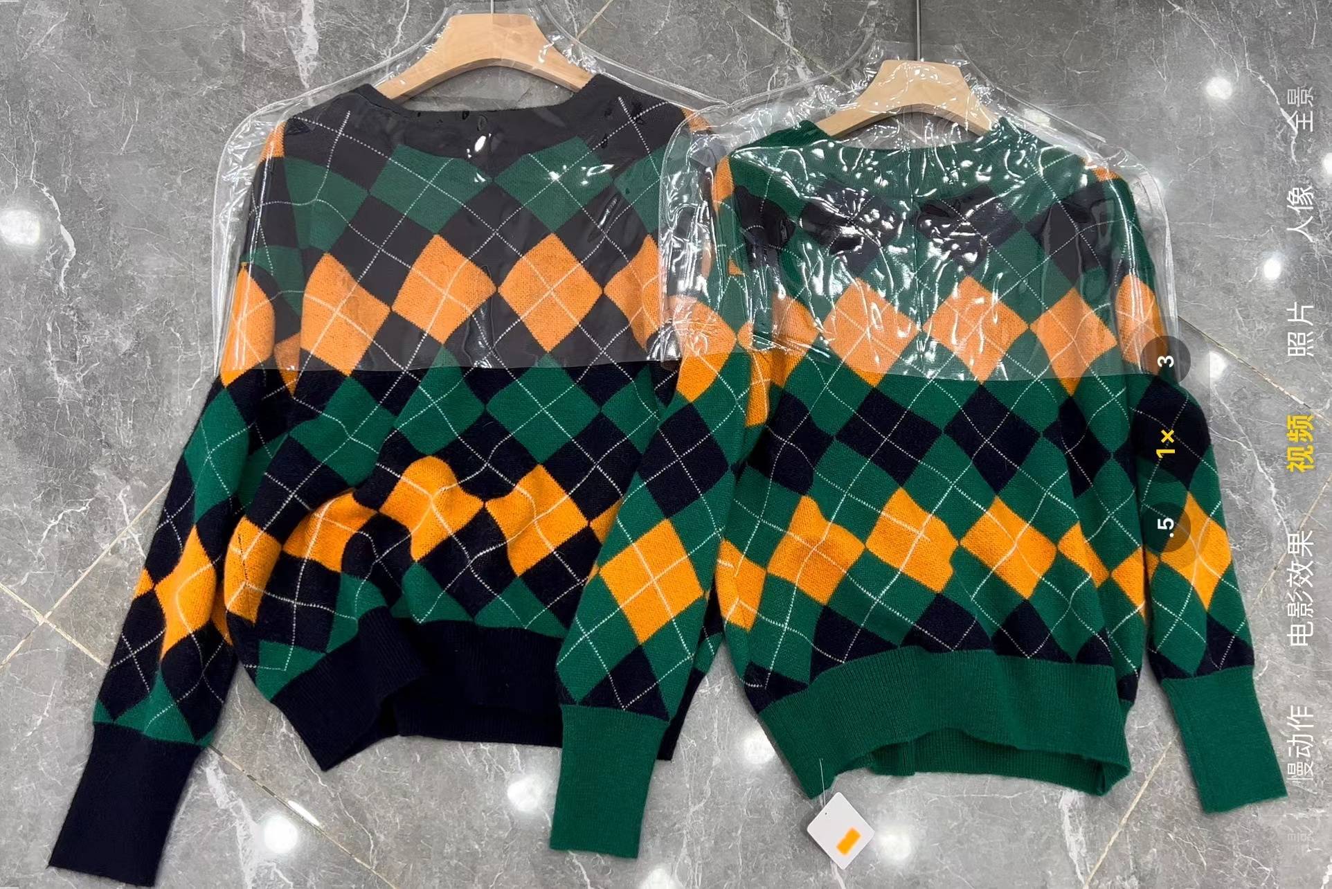 菱形格圆领深绿色毛衣