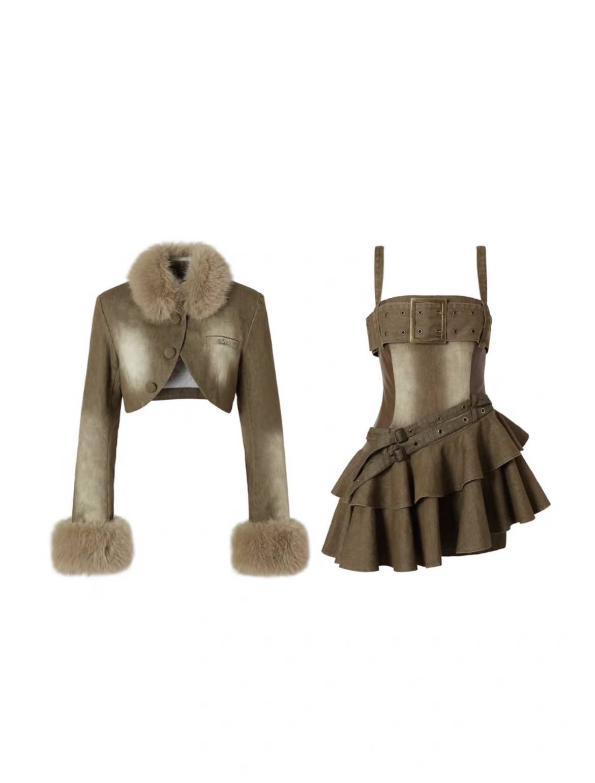 秋冬加州辣妹做旧夹棉棕色水洗牛仔夹克拼皮连衣裙套装