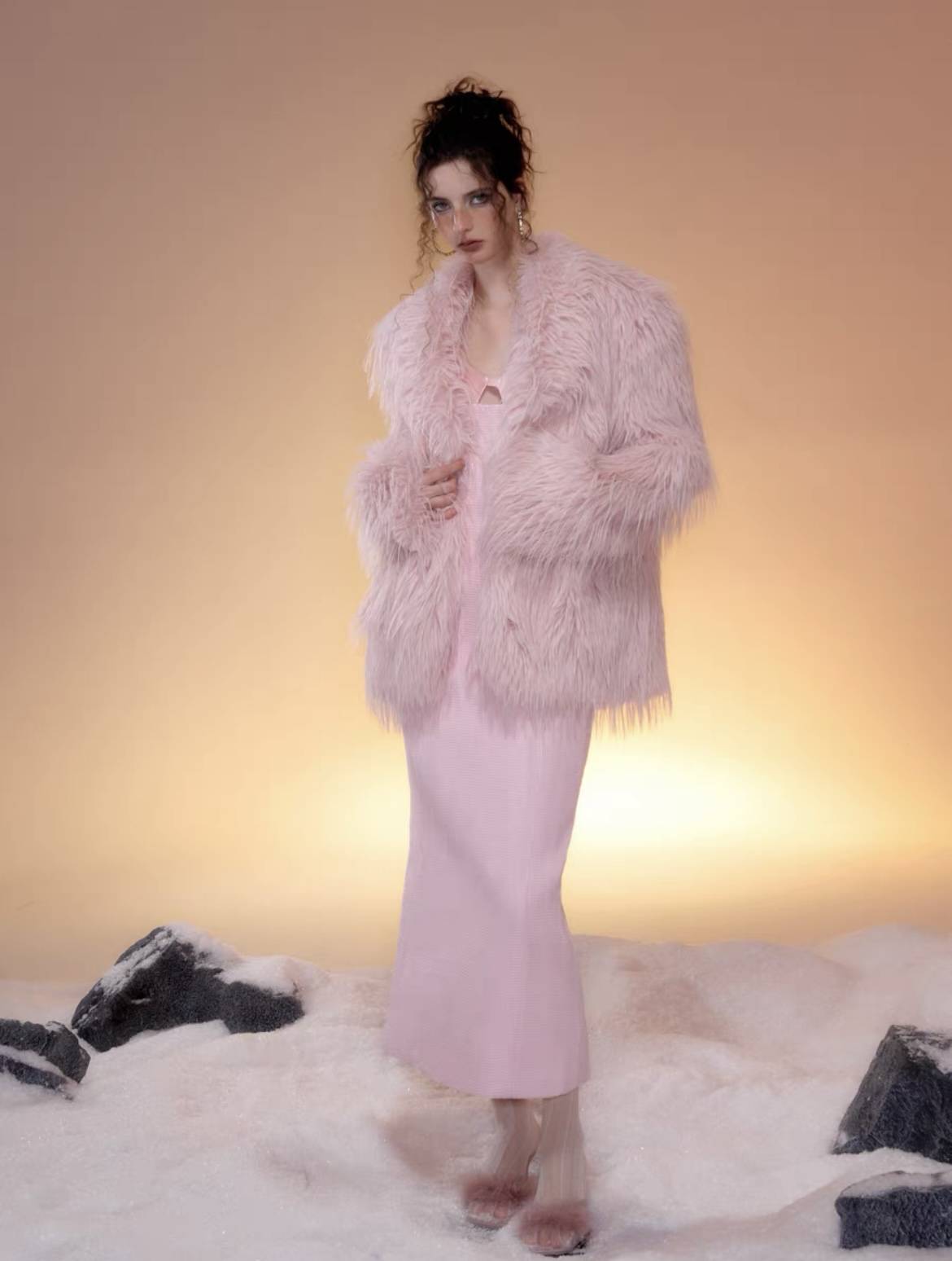 冬季复古甜心柔雾粉中长款皮草毛毛外套连衣裙长裙套装