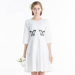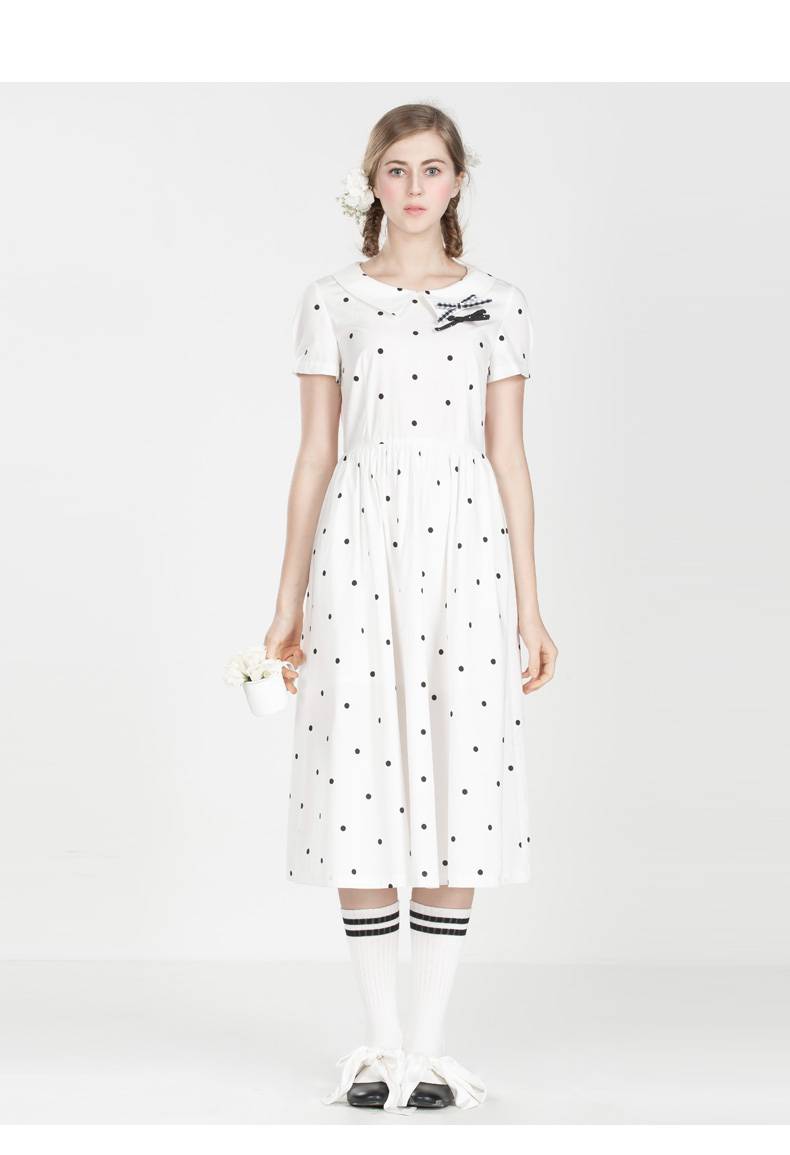 2018夏装新款印花翻领拉链高腰连衣裙海军风