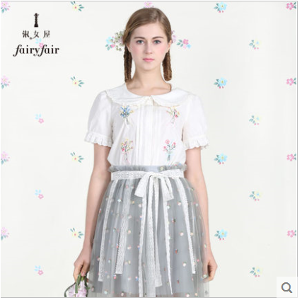 2018夏装新款花边翻领绣花镂空短袖白衬衣上衣女