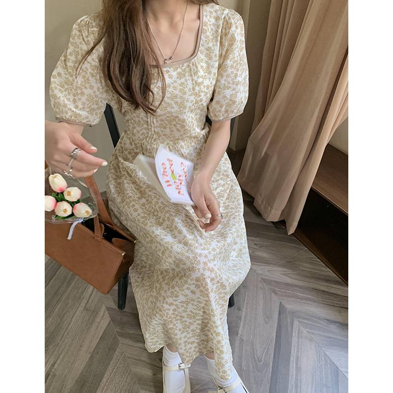 2021黄色清新甜美中长裙赫本风裙子复古连衣裙女装