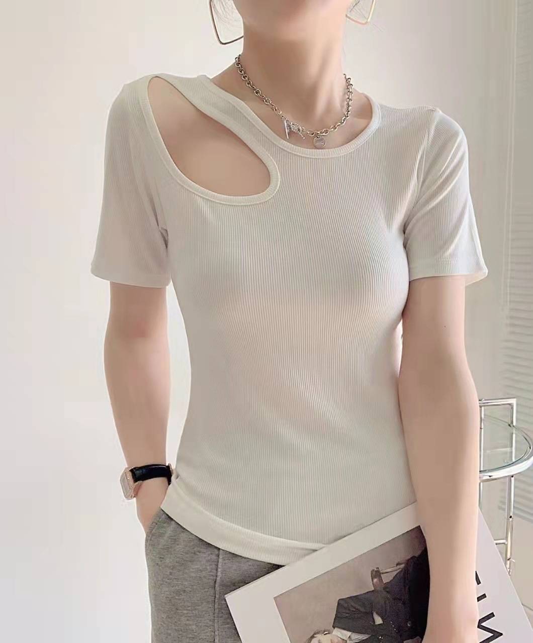 短袖t恤女夏季上衣性感百搭纯色镂空锁骨设计小众
