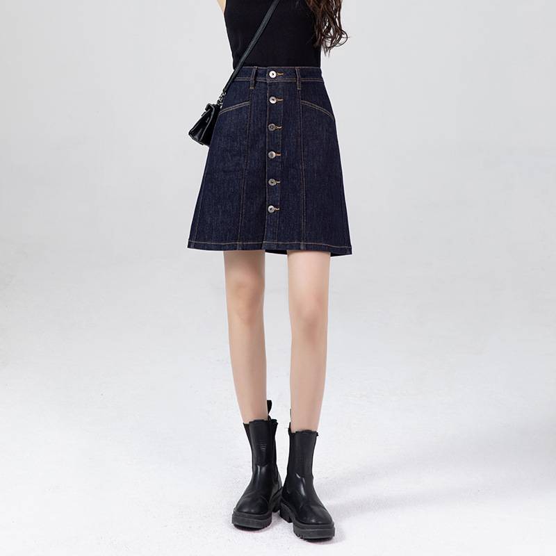 深蓝色牛仔高腰半身裙女 排扣型设计百搭款短裙