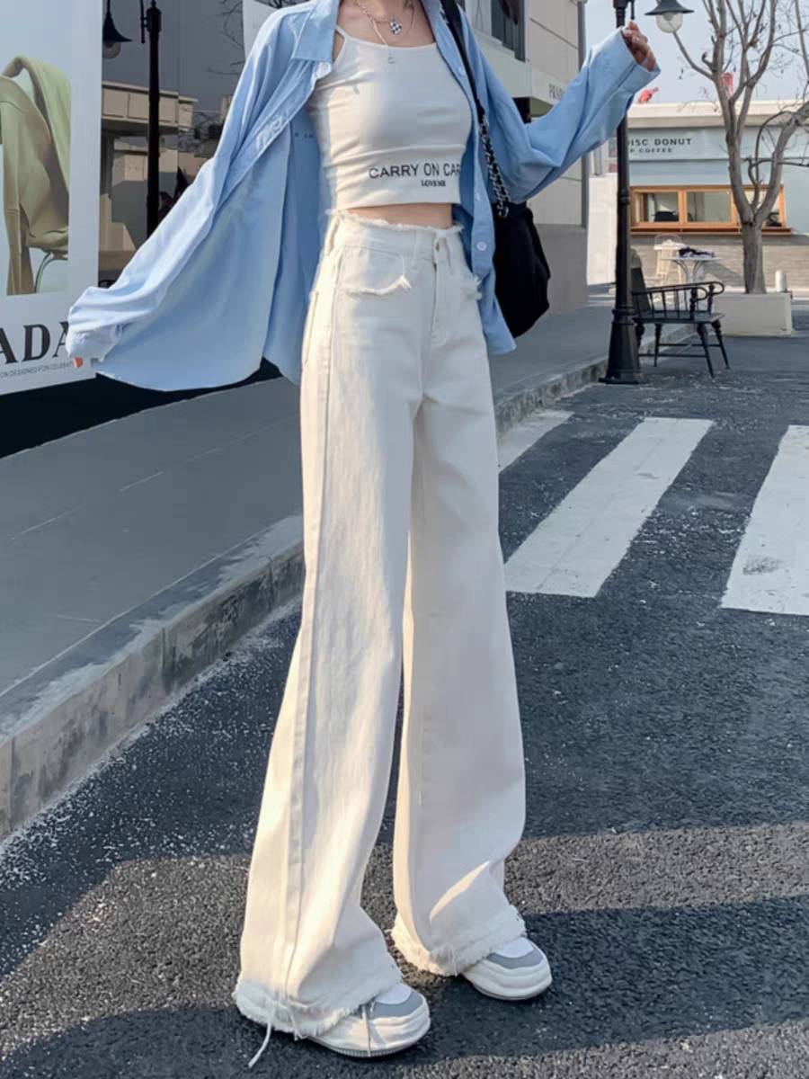 白色高腰毛边直筒牛仔裤女2023年春秋新款设计感小众阔腿拖地裤子