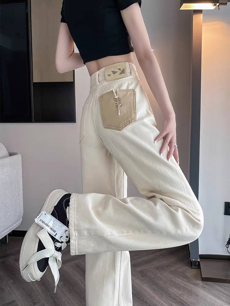 白色牛仔裤女直筒裤秋季高腰米白色加绒加厚小个子设计感阔腿裤子