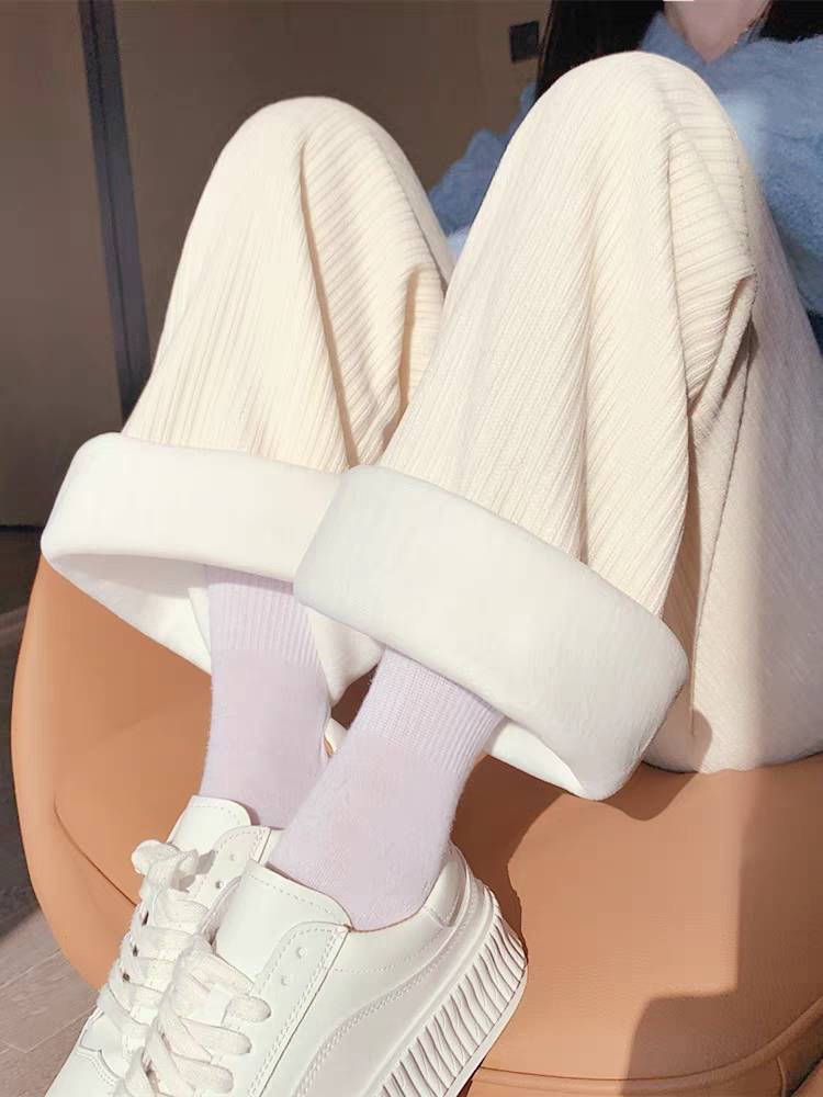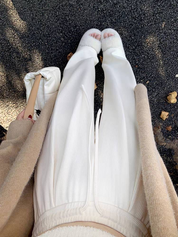 针织羊毛绒阔腿裤女秋冬季加绒高腰宽松垂感休闲直筒拖地白色裤子