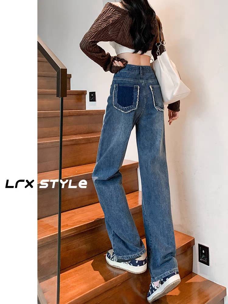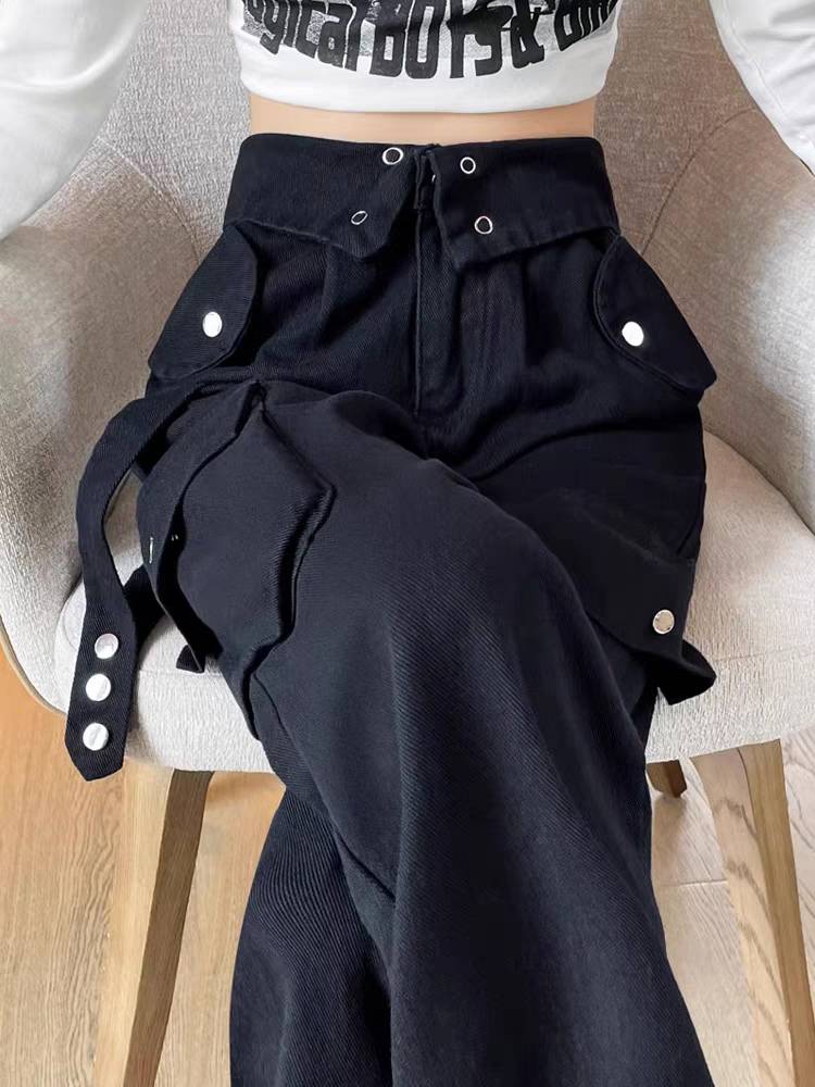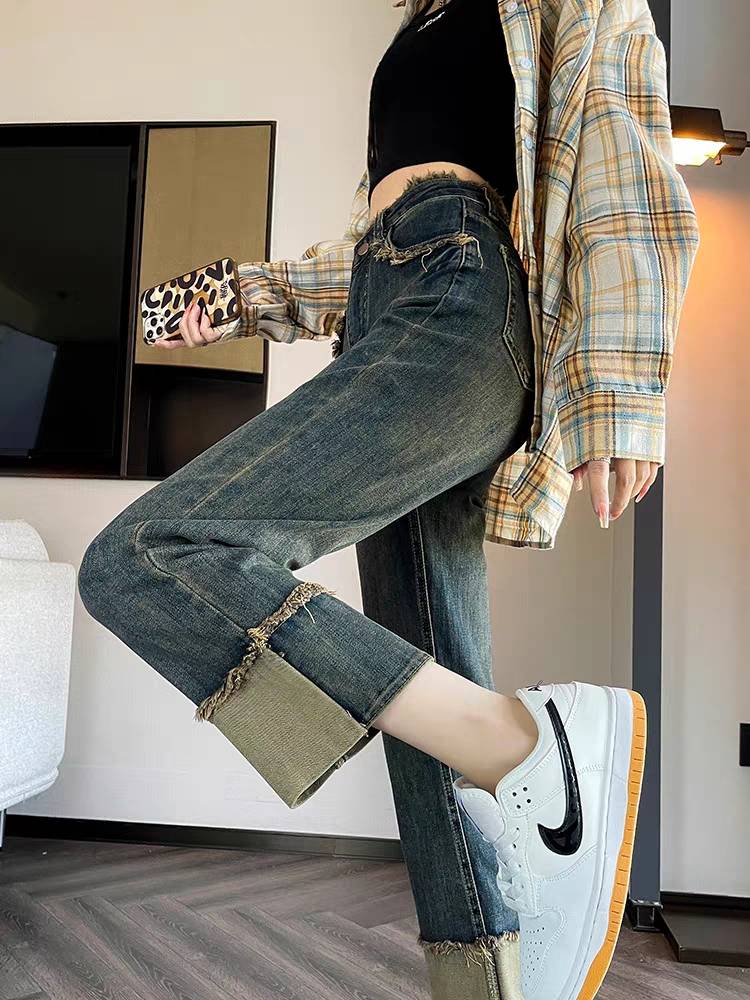 翻边纯棉工装牛仔裤女春秋2023年新款高腰垂感宽松加长窄版阔腿裤