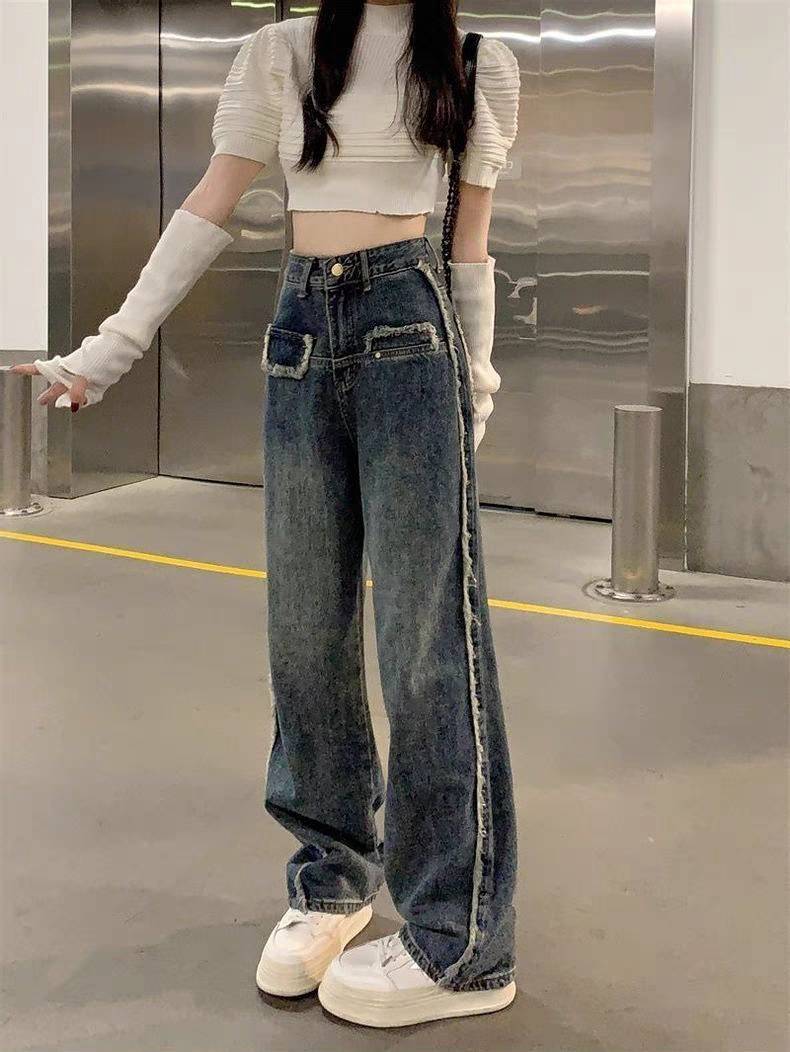 150小矮个子美式复古毛边牛仔裤女145高腰直筒阔腿拖地xs显高九分