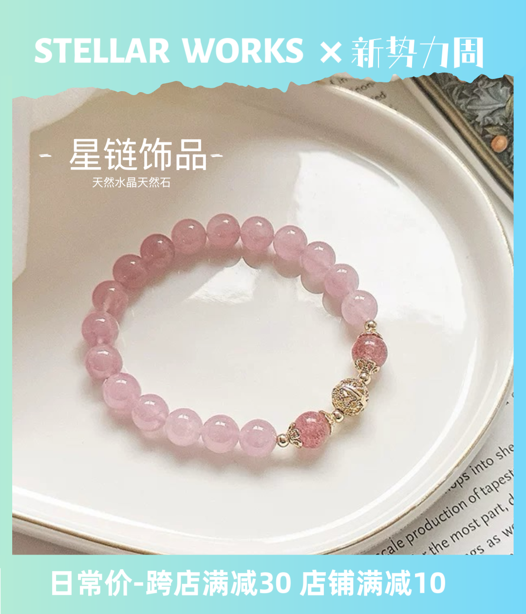 天然粉水晶草莓晶手链女轻奢小众简约设计粉晶手串女款铜镀金首饰