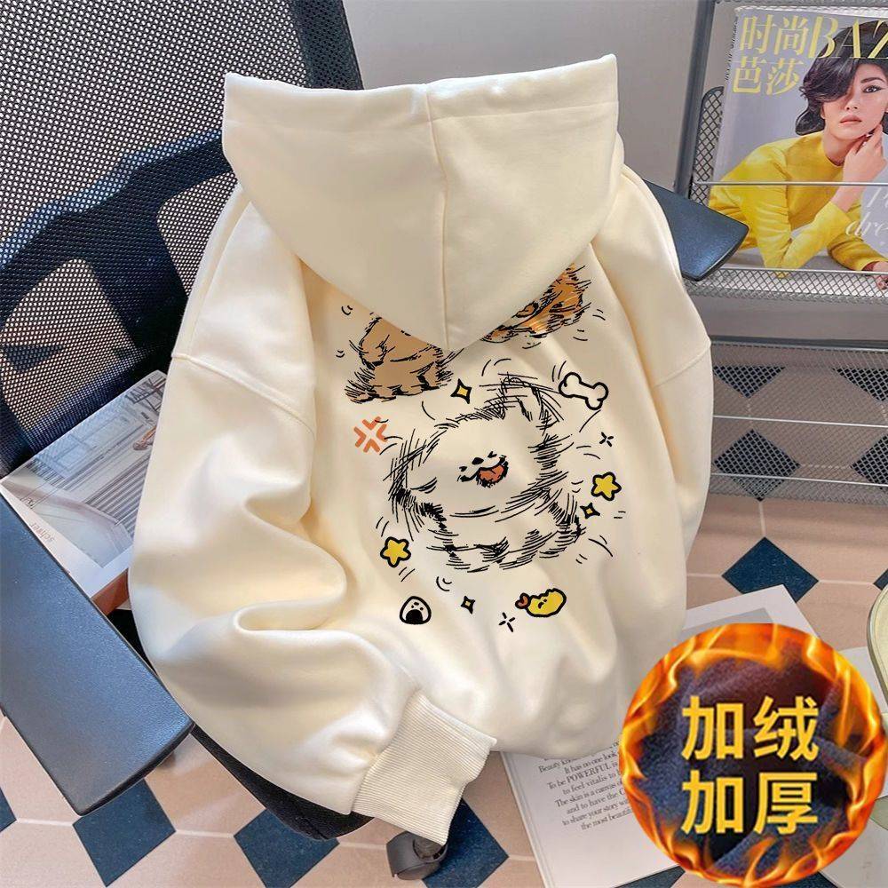 秋冬季新款港风潮牌宽松连帽卫衣学生小狗印花加绒情侣T恤1/2件