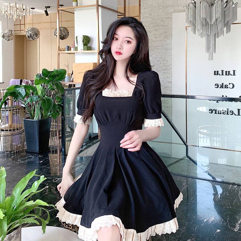 气质高腰显瘦泡泡轴不规则连衣裙女夏方领燕尾礼服A字小黑裙