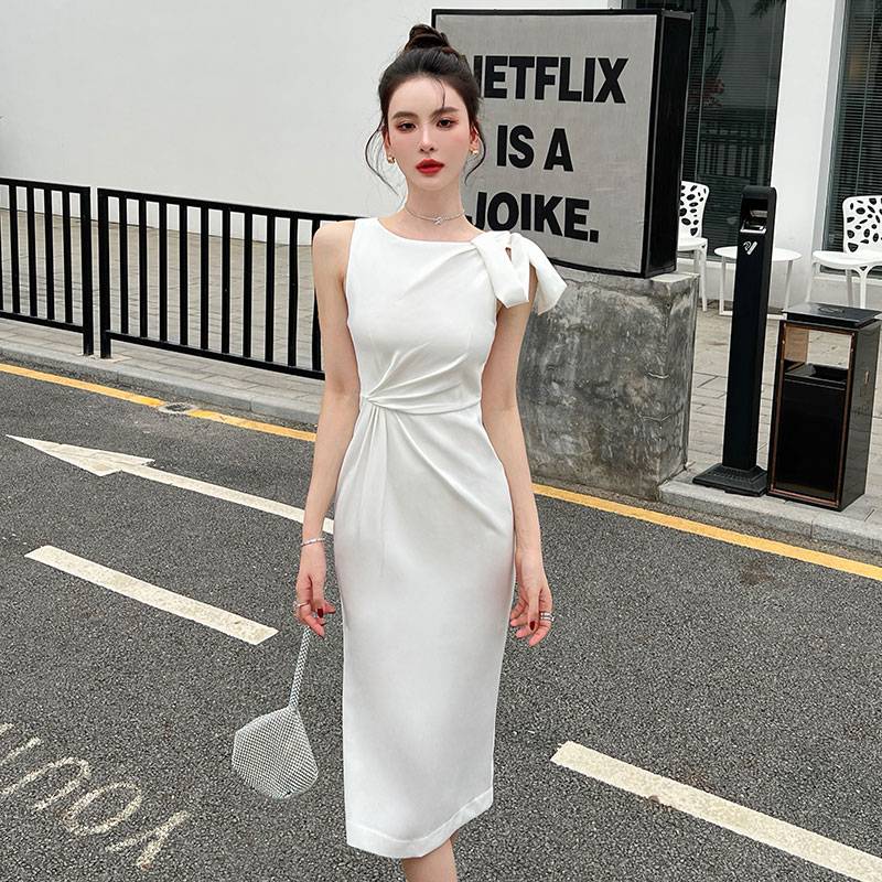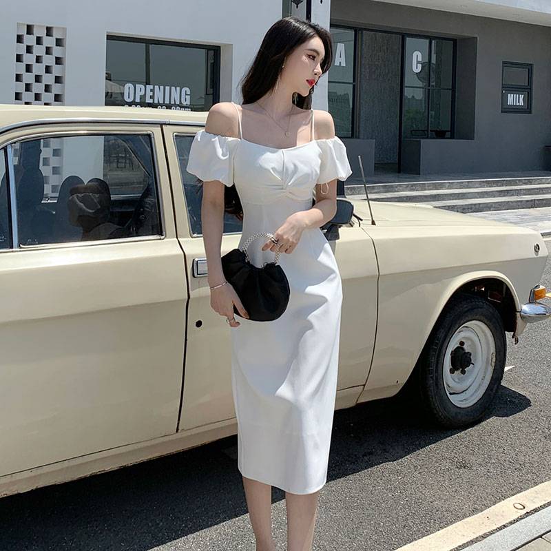 实拍扭结设计礼服裙露肩带短袖款显瘦高腰中长裙连衣裙