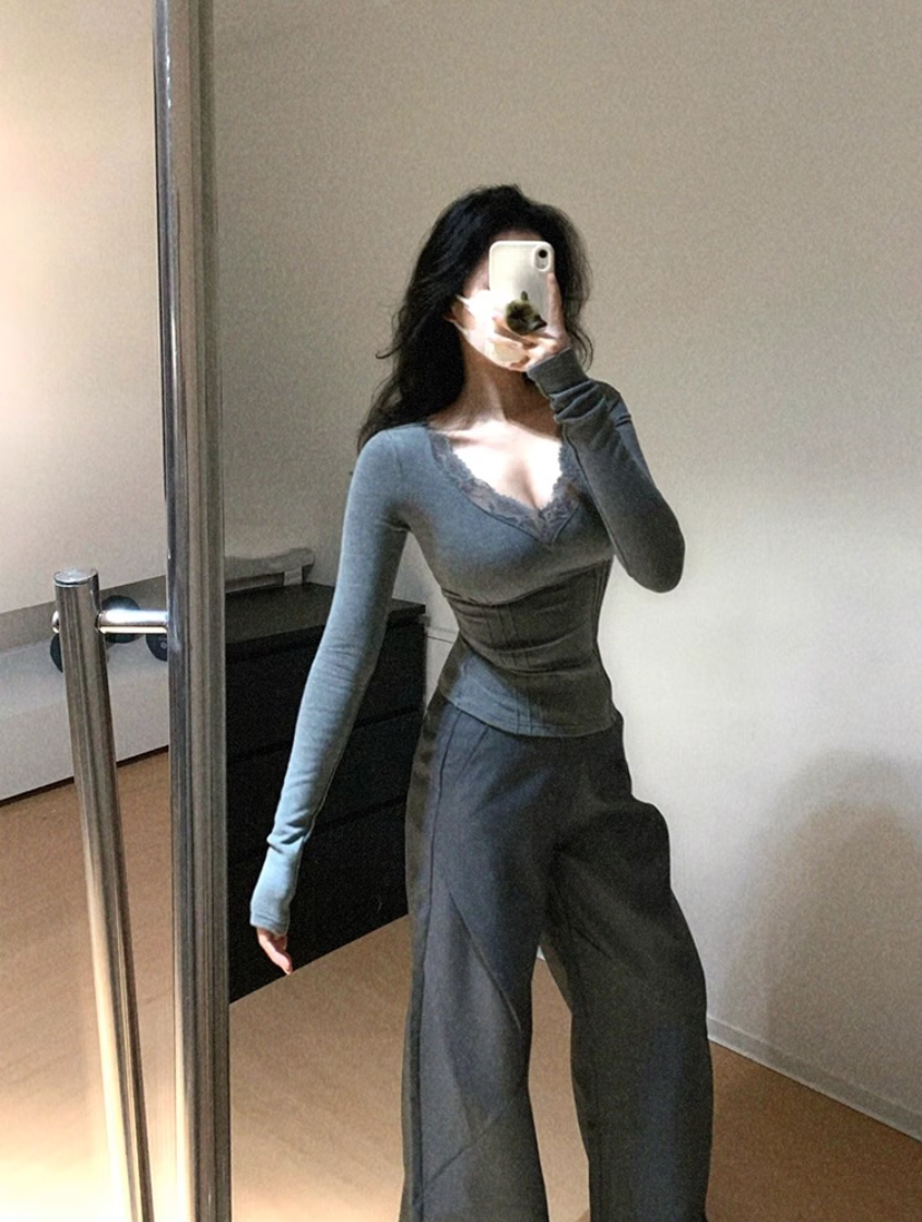 LDBE辣妹纯欲蕾丝拼接v领长袖t恤女2025新款修身内搭