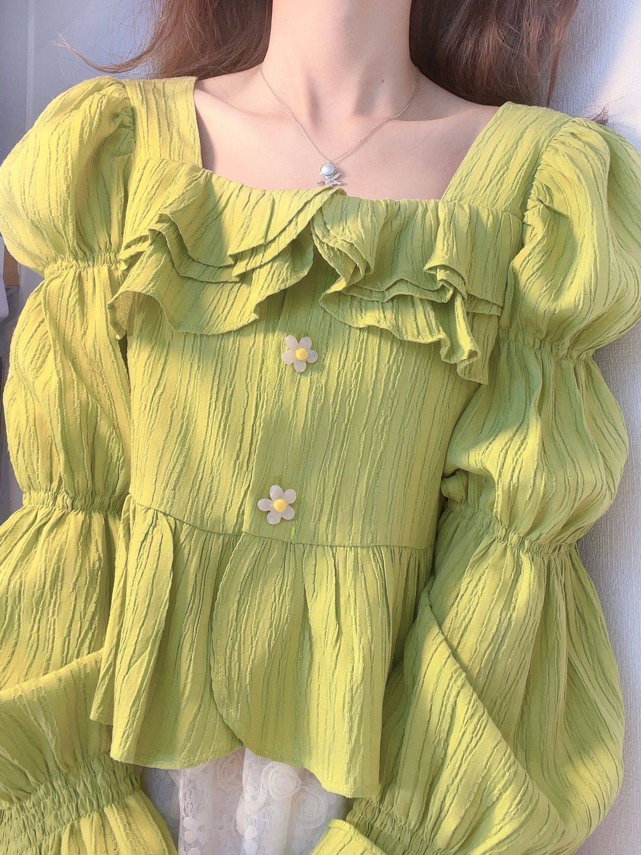法式复古绿色方领泡泡袖衬衫女春季设计感小众短款长袖娃娃衫上衣