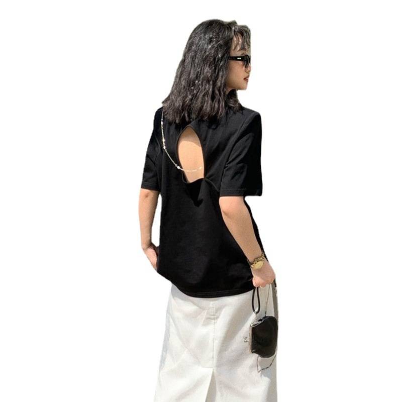 2022韩版小心机露背宽松T恤衫棉质套头百搭气质通勤短袖上衣女装