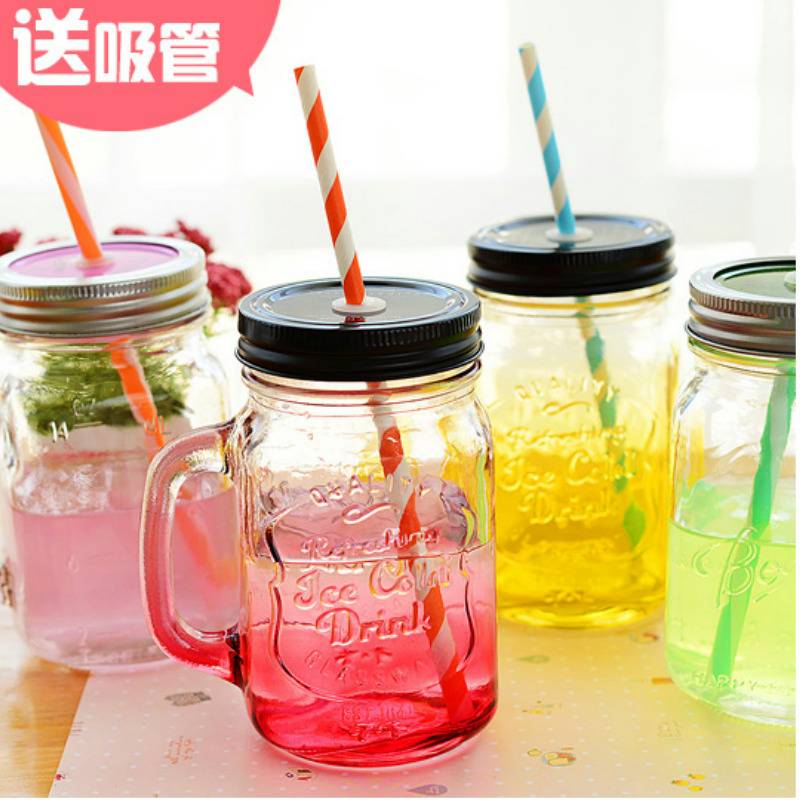 韩国创意吸管梅森杯个性情侣彩色柠檬果汁饮料玻璃水杯带盖公鸡
