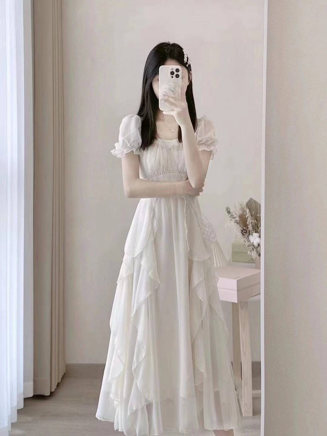 2023新款千金女主白色法式气质长款泡泡袖连衣裙