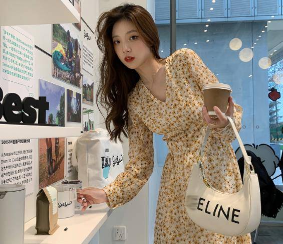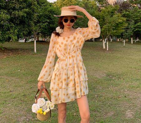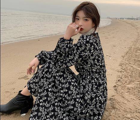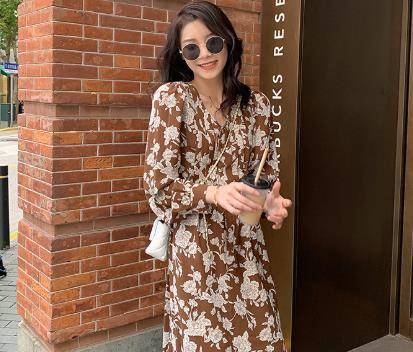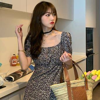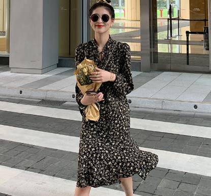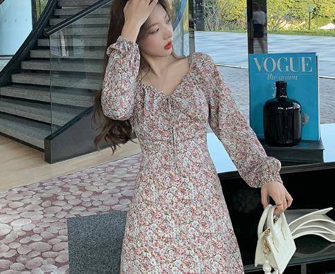 2021秋装韩国绉小碎花裙小个子法式连衣裙女