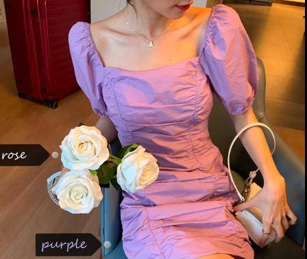 2021早春紫色裙子法式方领泡泡袖褶皱短款连衣裙女