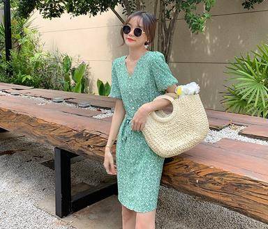 2020年新款夏季小清新超仙绿色碎花裙雪纺连衣裙女