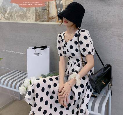 夏复古赫本风白色波点连衣裙女长款收腰显瘦长裙