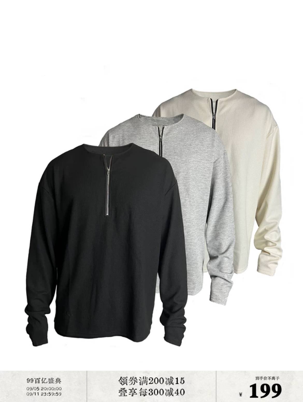 Fod 小众美式半拉链华夫格纯色长袖男薄