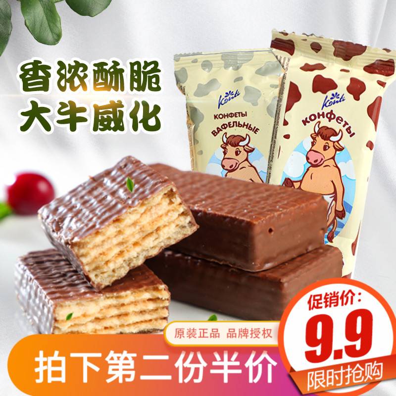 俄罗斯进口大奶牛巧克力威化饼干散装konti康吉牌牛奶零食品500g