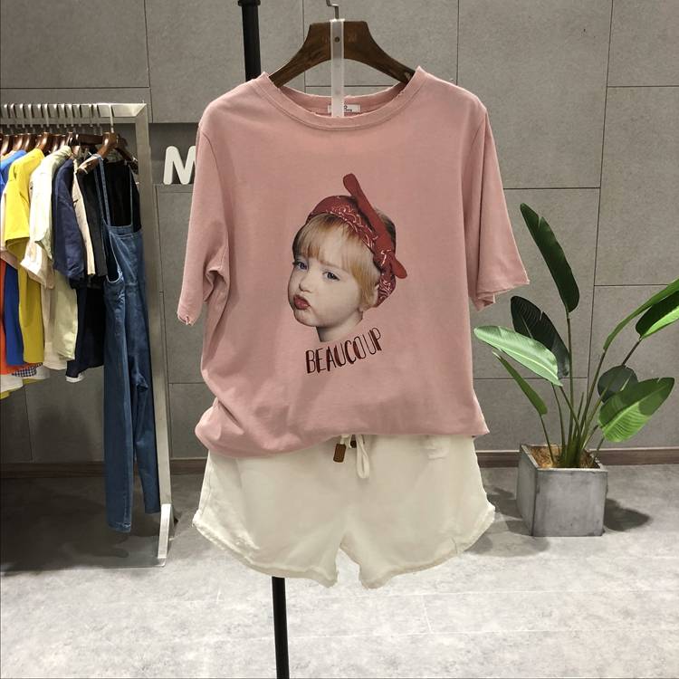 夏款2018新品6033前侧脸女孩印花圆领上磨破休闲百搭短袖T恤女
