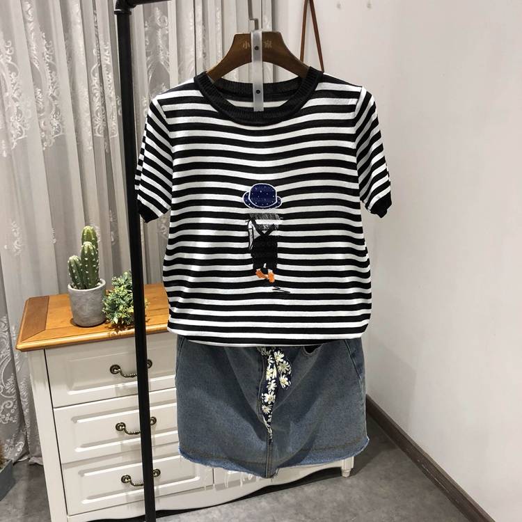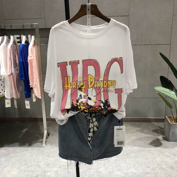 夏款2018新品9597前骑车女孩印花字母珠珠圆领磨破休闲短袖T恤女
