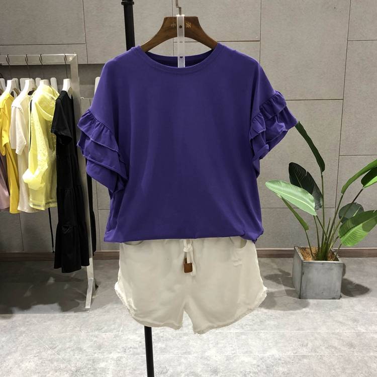 夏款2018新品21170双层大袖口圆领纯色韩版休闲T恤女