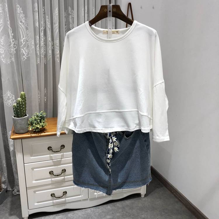 秋款2018新品0027圆领卷边下拼接后二粒扣装饰宽松短款纯色T恤女