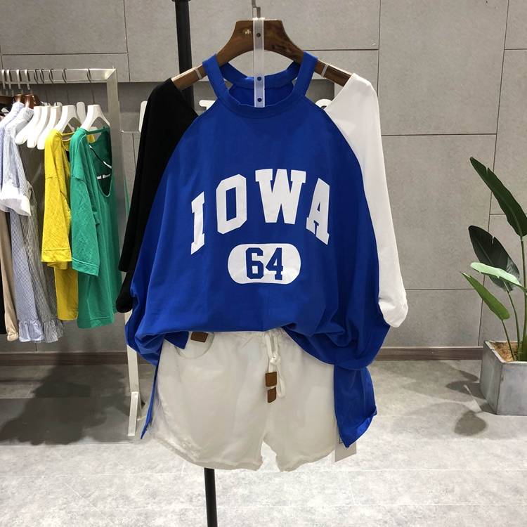 夏款2018新品857两袖不同色领边剪破前字母印花韩版宽松大版T恤女