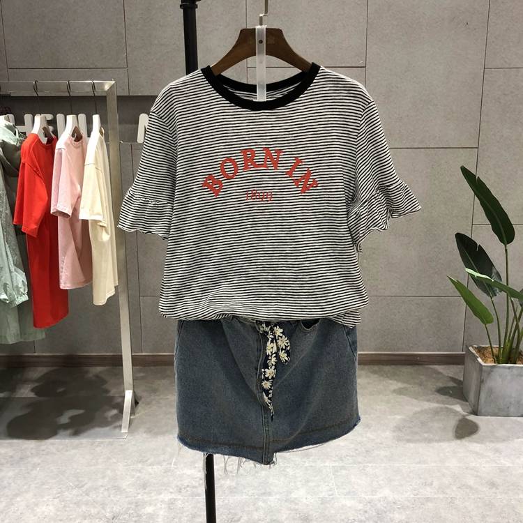 夏款2018新品582257前红字母印花喇叭袖口条纹韩版休闲T恤女