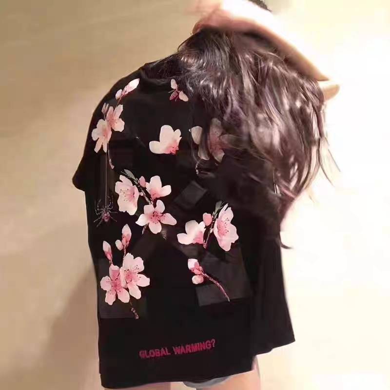 香港潮牌2021夏季樱花T恤女大码男女情侣装宽松纯棉直喷印花短袖t