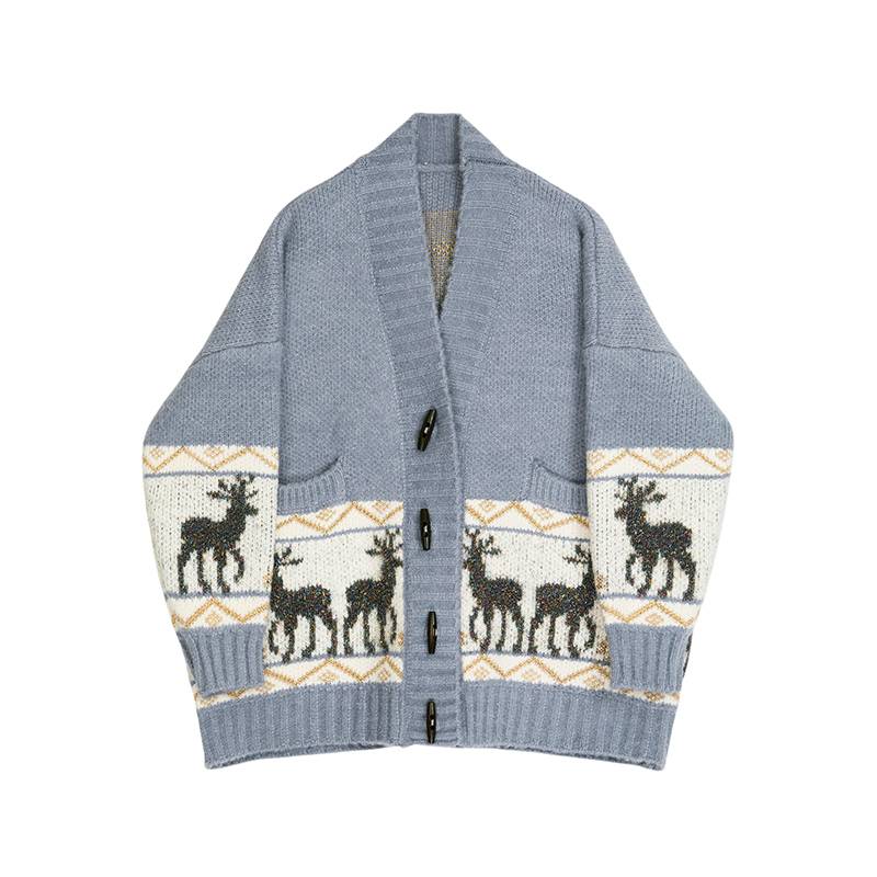 Felicials麋鹿印花毛衣女韩版2019春款牛角扣拼色针织毛衫开衫
