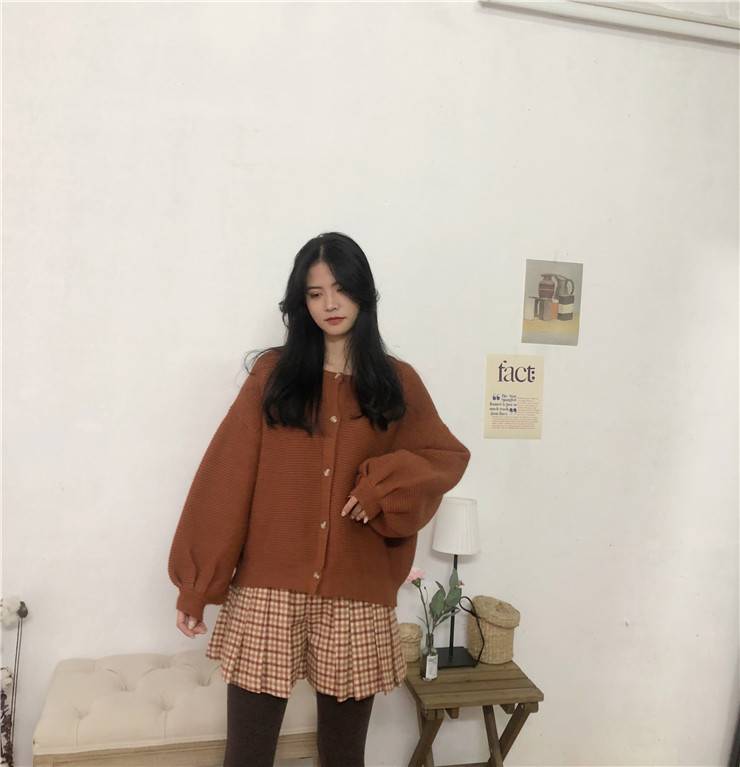 Felicials南瓜色复古圆领灯笼袖厚实毛衣短款宽松针织毛衣外套女
