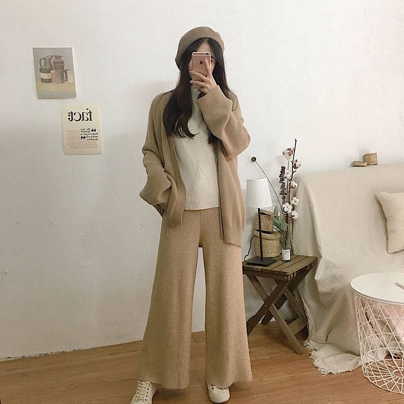 Felicials的小店穿上腿长两米长裤 秋冬温柔花杏色针织阔腿裤