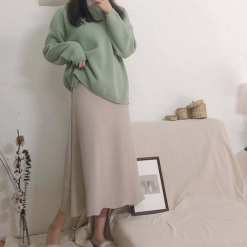 Felicials高品质超厚实温柔灰杏色半裙厚针织A字型宽松松紧腰中长裙