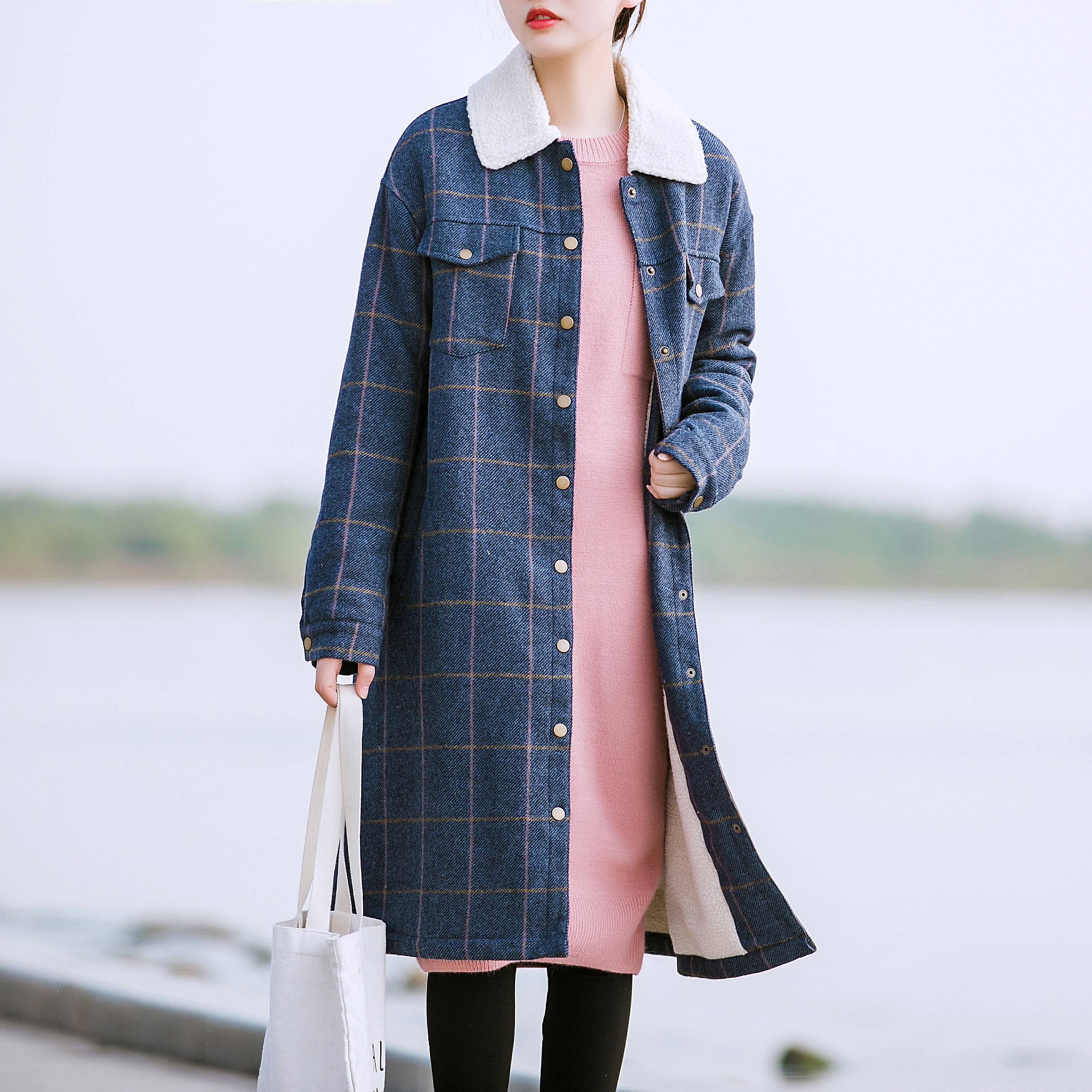 Felicials羊羔毛中长款加厚格纹毛呢大衣